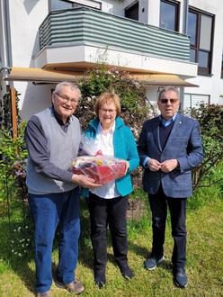 Der Bürgermeister der Stadt Lahnstein, Adalbert Dornbusch, überbrachte dem Jubiläumshochzeitspaar die Glück- und Segenswünsche des Oberbürgermeisters Lennart Siefert, des Landrats Jörg Denninghoff und der Ministerpräsidentin Malu Dreyer. Für die Stadt Lahnstein überreichte Bürgermeister Dornbusch einen liebevoll mit fair gehandelten Produkten zusammengestellten Präsentkorb aus dem Weltladen und ein Geldpräsent des Rhein-Lahn-Kreises.