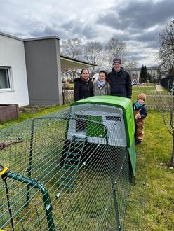 v. l. n. r.: Kassiererin Orawan Lechner, Vorsitzende Nadja Siefert und Vorsitzender Philipp Roth mit Sohn Emil präsentieren das neue Hühnerheim. (Fotos: FV)