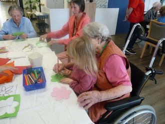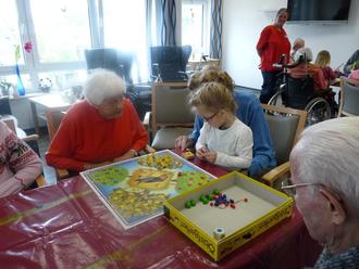 Kaum sind alle aus dem Aufzug gestiegen und haben sich in den Aufenthaltsraum begeben, wurden sie schon freudig und mit leuchtenden Augen begrüßt. Mit dabei waren nicht nur aufgeregte Kinder, sondern auch Blumen aus Tonkarton und verschiedene Brettspiele, die der ein oder andere Senior bestimmt noch aus seiner Zeit kannte. Die Blumen wurden gemeinsam bunt bemalt, wobei Teamwork großgeschrieben wurde und das ein oder andere Kunstwerk entstand. Beim Ausschneiden benötigte manches Kind Unterstützung, wobei die Senioren nicht lange überlegt haben und den Kindern tatkräftig zur Hand gegangen sind. Manch eine Blume wurde mit einem großen Lächeln im Gesicht verschenkt und die Senioren wollten diese am liebsten gar nicht mehr aus der Hand geben und bestimmt haben sie einen besonderen Platz in den Zimmern gefunden.