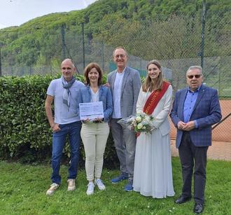 Günter Groß (Mitte) übergibt im Beisein von Rhein-Lahn-Nixe Lea I. und Bürgermeister Adalbert Dornbusch (rechts) den Spendenscheck an den 1. Vorsitzenden des TC Rhein-Lahn Torsten Kullmann (links) und an die Jugendwartin Sarah Wisberg (2. v. links). (Foto: TC RL)