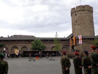 Abschließend wurde die Truppenfahne, symbolisch für die Auflösung des Bataillons, verhüllt. Dem Appell folgte ein Empfang in der Stadthalle, den die Stadt als Abschiedsgeschenk veranstaltete. Im Foyer hatte dazu das Stadtarchiv eine kleine Ausstellung zur Geschichte der Lahnsteiner Kaserne und der hier seit 1938 stationierten Einheiten gezeigt.