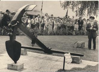 1975 wurde unter dem Vorsitz von Toni Hewel (rechts im Bild) vor der Kirche St. Barbara ein 20-Zentner-Stockanker als äußeres Zeichen der kirchlichen Verbundenheit der Schifferfamilie installiert. (Foto: Nachlass Schifferverein im Stadtarchiv Lahnstein)