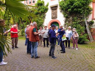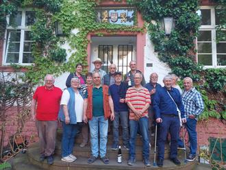 Die Weinwanderung in den Mauern der Stadt fand einen guten Anklang. Daran erinnert auch das Gruppenfoto vor dem Martinsschloss. Vorsitzender Markus Schild überreichte dem Stadtführer Michael Eisenbarth ein kleines Präsent als Dankeschön für seine Mühen.