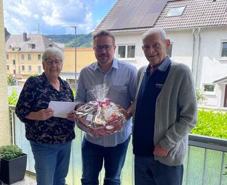 Sebastian Seifert, Beigeordneter der Stadt Lahnstein, überbrachte dem Jubiläumszeitspaar die Glückwünsche des Oberbürgermeisters Lennart Siefert, des Landrats Jörg Denninghoff und der Ministerpräsidentin Malu Dreyer. Für die Stadt Lahnstein überreichte er einen liebevoll mit fair gehandelten Produkten zusammengestellten Präsentkorb.