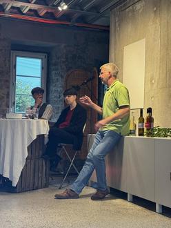 Viktor Lee und Hendrick Flacke ergänzten mit Literatur und Musik die spannenden und unterhaltsamen Geschichten des Winzers Peter Hohn zum Weinanbau und dessen Herstellung. Aufgrund des Wetters wurde die Veranstaltung spontan in die gemütlichen Räumlichkeiten des historischen Nassau-Sporkenburger Hofs verlagert. Dort, wo einst Kostüme hingen, traf man sich nun auf ein Glas Wein.
