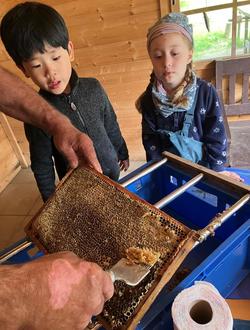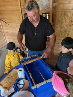 Michael Eckel zeigte den Kindergartenkindern wie Honig gewonnen wird.