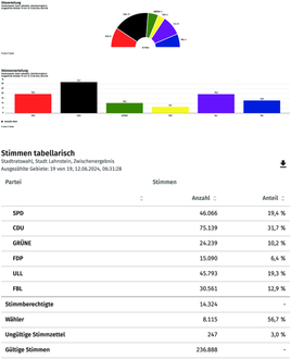 Dies wurde nun korrigiert, sodass sich das vorläufige amtliche Wahlergebnis wie folgt darstellt. Der Wahlausschuss der Stadt Lahnstein wird das amtliche Endergebnis in seiner Sitzung am 18. Juni 2024 feststellen.