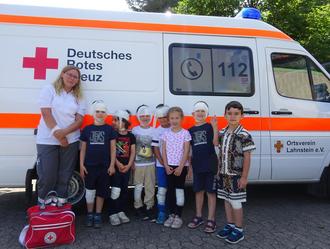 Für die vielen Fragen der Vorschulgruppe nahm sich die Sanitäterin viel Zeit. Der Höhepunkt war dann das Besichtigen des Rettungswagens. Natürlich wurde auch das Martinshorn eingeschaltet. Es war ein spannender Vormittag. Voller Stolz über das Erlernte, berichteten und zeigten sie den Anderen, was sie nun alles können und wissen. Frau Bröder hinterließ einen bleibenden Eindruck und so beschäftigte sich die Vorschulgruppe auch noch im Nachhinein mit dem Thema Erste Hilfe.