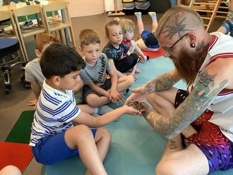 Am 26.06.24 besuchte Patrick Meyer vom Poecitarium Polch die Gruppe Franz-Hahn der Kita LahnEggs. Herr Meyer betreibt ehrenamtlich eine von Spenden finanzierten Reptilienauffangstation, die sogar besucht werden kann. Ganz aufgeregt und voller Vorfreude warteten die 22 Kinder auf Herr Meyer und seine etwas außergewöhnlichen „Haustiere“.