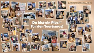 Die Collage zeigt Menschen aus allen Bereichen des Tourismus, die symbolisch das Pluszeichen in die Kamera halten - als Zeichen ihres Beitrags zum gemeinsamen Erfolg.