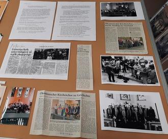 Sowohl der Bau des Gebäudes, das 1875 eingeweiht werden konnte, als auch die Veränderungen im Innern und die Außenrenovierungen sind darauf dokumentiert. Ein eigenes Kapitel bilden die Glocken, die wiederholt Opfer der Metallspende wurden und daher sowohl nach dem Ersten als auch Zweiten Weltkrieg neu gegossen werden mussten. Auch der Kirchenorgel und dem -chor waren Kapitel gewidmet. Dank Gabriele Kunze ist die Geschichte des Evangelischen Kirchenchores von 2002 bis 2023 – zuletzt als ökumenischer Chor – hervorragend dokumentiert. Vom Vorgängerchor, der 1886 als Männerchor und von 1895 bis 1983 als gemischter Chor bestand, ist leider nur wenig bekannt.