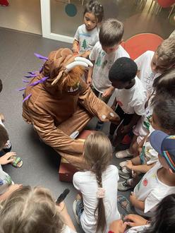 Nach fast 2 Stunden kehrte die Gruppe voller Eindrücke zurück zur Kita. Doch hier ging es direkt weiter. Denn in der Kita wartete der Grüffelo persönlich auf die Kinder. Und weil die Kinder dem Grüffelo helfen konnten, seine Angst vor der Maus zu verlieren, wurden alle zum Essen in seine Höhle eingeladen. Hier gab es leckere Fuchsspieße, gezuckerte Eule und natürlich Schlangenpüree.