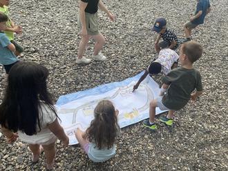 Nachdem die Betten aufgebaut und die Eltern verabschiedet waren, ging es für die Größten der Kita an das Lagerfeuer auf dem Außengelände. Hier bekamen sie das Buch vom Grüffelo vorgelesen. Danach folgte eine Entdeckungstour in Richtung Rhein. Jetzt tauchten die Kinder selbst in die Geschichte des Grüffelos ein. An verschiedenen Stationen trafen die kleinen Entdecker Fuchs, Eule und Schlange.