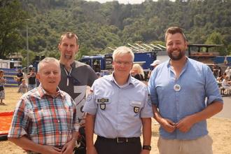 v. l.n. r.: Bürgermeister Adalbert Dornbusch, Beigeordneter Jochen Sachsenhauser, Stephan Heinz des THW Lahnstein und Oberbürgermeister Lennart Siefert auf der Jubiläumsveranstaltung des THW Ortsverbandes Lahnstein (Foto: THW)