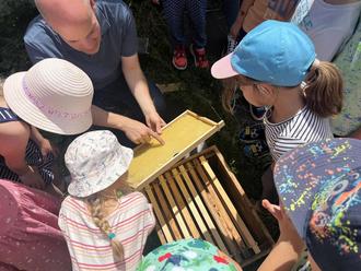 Er führte die Gruppe zu einem der Bienenstöcke, wo sie das emsige Treiben der Bienen beobachten konnten. Obwohl das Gewusel auf den ersten Blick ordnungslos erschien, versicherte er, dass hinter diesem „Bienen-Chaos“ ein hochkomplexes und gut organisiertes System steckt. Er nahm sich die Zeit, den Kindern viele interessante Fakten über Bienen zu vermitteln und deren wichtige Rolle im Ökosystem zu erläutern.