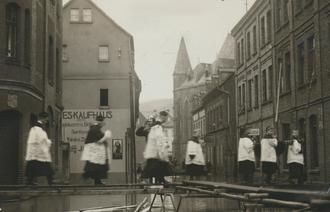 Straßenkreuzung Emser Straße / Brückenstraße: Pfarrer Ludwig mit Messdienern auf dem Rückweg einer Beisetzung. Im Hintergrund die alte Barbarakirche auf dem Kirchplatz