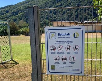 Der Bolzplatz ist in der Zeit von 08.00 bis 20.00 Uhr geöffnet, die Benutzung erfolgt auf eigene Gefahr.