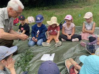 Auch dieses Jahr durften sich die Kinder über den Besuch des Natur-Erlebnispädagogen und Waldprofis Willi Bausch-Weis freuen. Gemeinsam sind sie auf eine große Wiese gewandert und haben Insekten gesucht. Heuschrecken wurden in Becherlupen gesammelt und ausgiebig beobachtet.