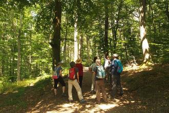 Dr. Wolfgang Schnabl führt die Wandergruppe durch den Lahnsteiner Kur- und Heilwald.