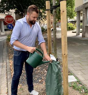 „Die frisch gepflanzten Bäume haben noch keine tiefreichenden Wurzeln und sind auf eine regelmäßige Bewässerung angewiesen.“, erklärt Oberbürgermeister Lennart Siefert. Für eine ausreichende Langzeitbewässerung der jungen Bäume sorgen Bewässerungsbeutel. Diese wurden ihnen wie ein Mantel um den Stamm gelegt, per Reißverschluss zugezogen und müssen nun regelmäßig mit Wasser aufgefüllt werden. Tropfen für Tropfen garantiert ein voller Beutel eine gleichmäßige Bewässerung des Baumes.