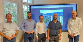 Nach einem guten Austausch und der geplanten Zusammenarbeit waren alle Beteiligten zufrieden. V. l. n. r. Pedro Hillen, stellvertretender Fachbereichsleiter Ordnung und Verkehr Lahnstein; Oberbürgermeister der Stadt Lahnstein, Lennart Siefert; Oberbürgermeister der Stadt Koblenz, David Langner; Stefan Buchner, Teamleitung temporärer Maßnahmen des Tiefbauamtes der Stadt Koblenz; Marcus Uhrmacher, Abteilungsleiter Verwaltung des Tiefbauamtes der Stadt Koblenz