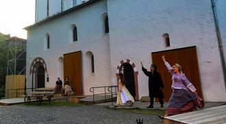An der mittelalterlichen Johanniskirche zeigt das Lahnsteiner Theater zum letzten Mal die Geschichte der wissbegierigen und mutigen Johanna, die sich als Mann ausgibt und durch eine Verkettung von mehreren Umständen an die Spitze der katholischen Kirche gewählt wird.