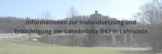 An dieser Stelle wird über die Baumaßnahmen informiert. Weitere Informationen sind über die Seite www.lahnstein.de/lahnbruecke abrufbar, von der aus auch auf die umfangreiche Informationsseite des LBM Diez verlinkt wird.