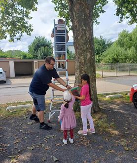 Gemeinsam mit Mitarbeitern des Bauhofs suchten die Kitakinder nach geeigneten Plätzen und hingen die Kästen auf.