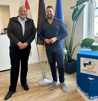 Lahnsteins Oberbürgermeister Lennart Siefert tauschte sich mit Brigadegeneral Dr. Frank Utzerath (l.) aus, der zum 1. Oktober 2025 die Position des militärischen Vizepräsidenten im Bundesamt für Ausrüstung, Informationstechnik und Nutzung der Bundeswehr übernimmt. (Foto: Eva Dreiser / Stadtverwaltung Lahnstein)