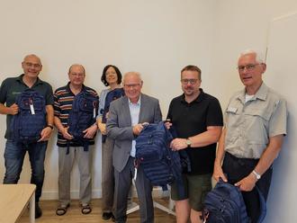 v.l.n.r.: Andreas Nick, Dr. Jörg Henning, Astrid Haderlein, DRK-Vorsitzender Peter Labonte, Beigeordneter Sebastian Seifert und Willi Bausch-Weis bei der Übergabe der Rucksäcke im Rathaus (Foto: Stadtverwaltung Lahnstein)