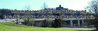 An dieser Stelle wird über die Baumaßnahmen informiert. Weitere Informationen sind über die Seite www.lahnstein.de/lahnbruecke abrufbar, von der aus auch auf die umfangreiche Informationsseite des LBM Diez verlinkt wird.