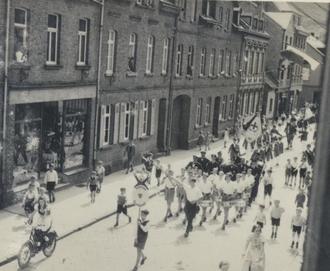 Heute wird eine viel befahrene Straße in Oberlahnstein gesucht. Das Foto ist aus den 1930er Jahren und zeigt Schützen, wie sie zu ihrem Festplatz maschieren.