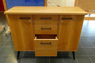 Unter den überaus ansehnlichen und kreativen Möbelstücken fanden sich z.B. ein sechseckiger Schachbretttisch, ein Massivholz-Schreibtisch, eine Anrichte, ein Sideboard mit lackierter Weltkarten-Front, verschiedene Kommoden und ein Nachttisch, ein Schminktisch, ein TV-Schrank, ein Flur-Möbel und ein bewusst robust gestaltetes Arbeitsankleidemöbel. Verwendete Hölzer waren dabei vor allem Massivhölzer von Nussbaum, Eiche und Esche, aber auch Furniere kamen hier und da zum Einsatz.