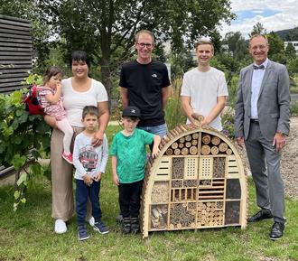 Die kleinen 'Kita-Insektenforscher' Maja, Eugen und Emil nehmen gemeinsam mit Orawan Lechner (links) und Philipp Roth (Mitte) vom Förderverein und Erzieher Manuel Hein (2. v. rechts) das Insektenhotel in Betrieb und bedankten sich herzlich bei Günter Groß, Bereichsleiter der Volksbank Rhein-Lahn-Limburg (rechts). (Foto: Voba Rhein-Lahn-Limburg)