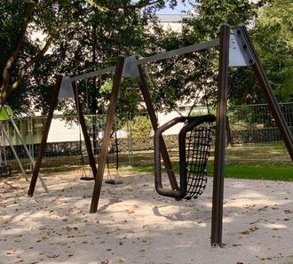 Auf der Inklusionsschaukel können auch Kinder, die auf einen Rollstuhl angewiesen sind, sicher schaukeln.