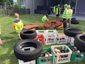 Zwei Kolleginnen machten sich hierfür auf die Suche nach passendem Material. Alte Autoreifen wurden von netten Nachbarn gestellt, ein paar Bretter im Keller gefunden und bereits in der Kita vorhandene Gegenstände wie Bälle, Schubkarren, Absperrband und Warnwesten zusammengesucht. „Besonders möchten wir der Lahnsteiner Brauerei für die große Spende an leeren Getränkekisten danken, welche sehr flexibel in der Baustelle einsetzbar sind“, so Kitaleitung Björn Schrewe-Mangold. Auch der Förderverein setzte sich für das neue Projekt ein und stellte einen Weidentunnel, der die Bewegungsbaustelle optisch umrahmt und bei den Kindern sehr beliebt für Versteckspiele oder Besprechungen zwischen den „Bauarbeitern“ ist.