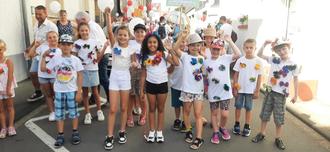 Sie trugen dabei weiße T-Shirts, bunt geschmückt mit selbst gebastelten Kreppblumen, sowie zum Teil bunte Regenschirme und Hüte.