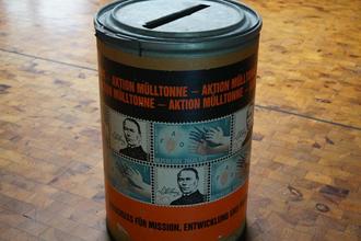 Zugunsten der Internationalen Berufsausbildung von Jugendlichen werden gebrauchte Briefmarken in der Tonne gesammelt, die im Foyer des Pfarrzentrums steht. (Foto: Th. Schneider)