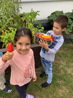 Jetzt endlich war es soweit, die Früchte konnten geerntet werden. Beim Ernten konnten die Kinder die ersten Früchte naschen und den Rest stolz in die Küche bringen, wo sie zu einem leckeren Mittagessen verarbeitet werden.