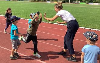 Begonnen hat die Gruppe mit einer Wiesenwoche, dazu haben sich morgens alle Kinder und Erzieherinnen und Erzieher bei schönstem Wetter am Rhein-Lahn-Stadion getroffen.