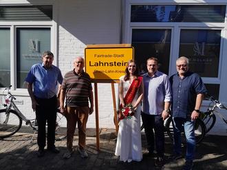 v.l.: Gerhard Dienser und Bernhard Kilbinger vom Eine-Welt-Laden, Rhein-Lahn-Nixe Sarah, die Erste, Beigeordneter Seifert und Bürgermeister Johannes Lauer von der Stadt Lahnstein. (Foto: Kilbinger)