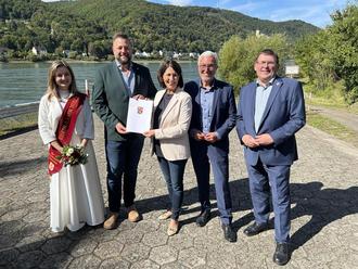 Verkehrsministerin Daniela Schmitt überreicht Oberbürgermeister Lennart Siefert den Förderbeschied zum Ausbau des Rad- und Gehwegs entlang des Rheins in Lahnstein.