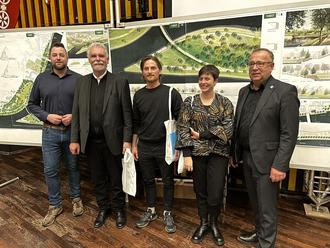 v. l. n. r.: OB Lennart Siefert zusammen mit den Siegern des Gestaltungswettbewerbs Christof Geskes, Marco Mattelig und Chiara Bellesi der geskes.hack Landschaftsarchitekten GmbH und dem Geschäftsführer der BUGA 2029 gGmbH Sven Stimac vor den Siegerentwürfen (Foto: Mira Bind / Stadtverwaltung Lahnstein)