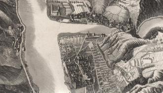 Der Kupferstich von 1837 verdeutlicht die Lage der beiden Siedlungen Ober- und Niederlahnstein (F.W. Delkeskamp, Neues Panorama des Rheins, 1837). Burgen, Stadtmauern und -türme entstanden erst im 13. und 14. Jahrhundert.