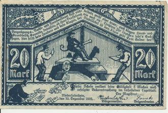Auf der Vorderseite trägt der Schein das Bild der Johanniskirche, eingerahmt zu beiden Seiten von dem Stadtwappen und der Wertangabe „Gut für 20 Mark“. Die Drucklegung erfolgte Mitte Dezember durch die Firma Schickel, Inhaber Fritz Nohr, die auch die Lahnsteiner Zeitung herausgab.
