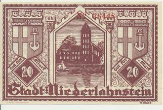 Im Herbst 1922, wenige Wochen nachdem die Stadt Oberlahnstein Notgeld herausgab, ließ auch Niederlahnstein „zur Erleichterung des Zahlungsverkehrs“ städtisches Notgeld als gesetzliches Zahlungsmittel für den Ortsbereich drucken. Es handelt sich um 20-Mark-Scheine, die motivgleich in grünschwarz, blauschwarz und rotbraun gedruckt wurden. Unterzeichnet von Bürgermeister Rustenbeck und dem Beigeordneten Faust, tragen sie als Datum den 10. Dezember 1922.