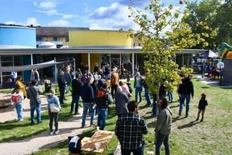 Begrüßt wurden die Besucher mit dem eigenen Kita-Lied, welches eine Kollegin selbst geschrieben hat. Kita-Leiter Björn Schrewe-Mangold begrüßte die Eltern und wünschte allen einen schönen Tag und ein paar schöne Stunden bei Würstchen mit Salaten, Kaffee und Kuchen und guten Gesprächen mit anderen Eltern.
