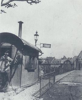Erstes Brückenhäuschen aus Blech mit Brückengelderheber Karl Knipp (im Volksmund „dä Breckekall“), im Hintergrund die erste mit Bohlen belegte Straßenbrücke