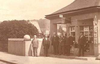 Zweites Brückenhäuschen von 1927 als Kiosk, hier kurz nach Eröffnung der neuen Lahnbrücke mit Bürgermeister Dr. Walter Weber (2. v. l.) und weiteren Personen (Fotos: Sammlung Stadtarchiv Lahnstein)