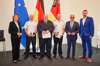 Stellvertretend für 50.000 Einsatzkräfte, die mit der Fluthilfemedaille ausgezeichnet werden, wurde diese an rund 60 Helferinnen und Helfer der beteiligten Blaulichtfamilien verliehen. So auch an Wehrleiter Marcus Schneider, Andreas Seil und Kai-Uwe Dannenberg von der Freiwilligen Feuerwehr Lahnstein, die in Begleitung des Beigeordneten Jochen Sachsenhauser bei der Feierstunde in der Staatskanzlei anwesend waren.